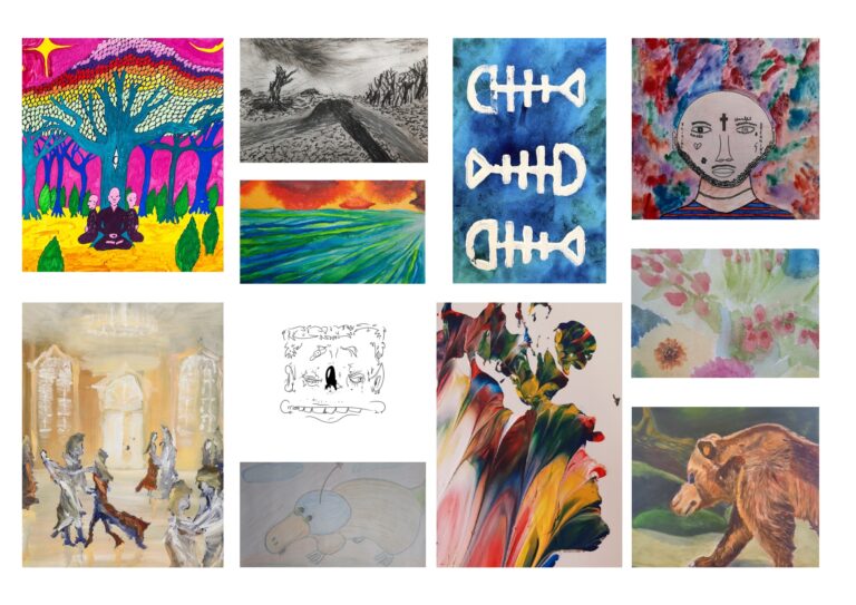 Die Ausstellung vereint Werke von Teilnehmer*innen aus den Bereichen Kunsttherapie und Offenes Atelier der Beschäftigungstagesstätte von Lebenswelten e.V., die in unterschiedlichen Kontexten künstlerisch tätig sind.