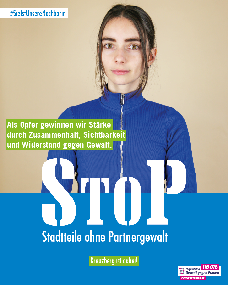 Ergänzend dazu zeigt die Plakatreihe „Sie ist unsere Nachbarin“, wie Menschen aus Kreuzberg Gesicht und Haltung zeigen. Sie positionieren sich gegen Partnergewalt und bekennen sich zu Solidarität und Zivilcourage. Unter dem Motto „Wir schauen hin und stehen an der Seite der Betroffenen“ setzt die Kampagne ein starkes Zeichen für Empathie, Aufmerksamkeit und gesellschaftliche Verantwortung.